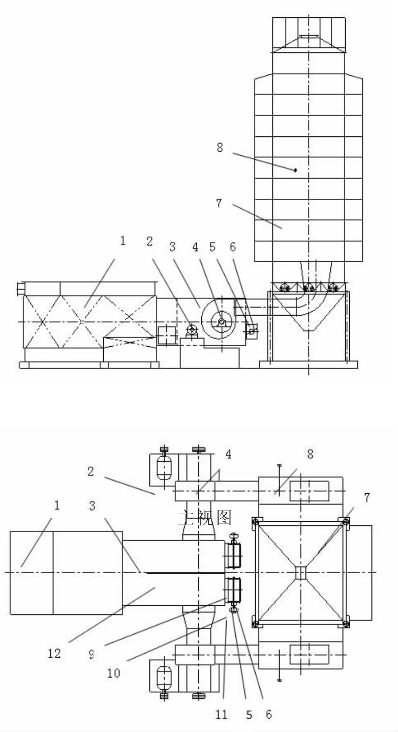 1.熱交換器;2.電機(jī);3.混合室;4.主風(fēng)機(jī);5.調(diào)風(fēng)筒;6.風(fēng)門板;7.種子干燥機(jī);8.溫度傳感器;9.閥門軸;10.聯(lián)軸器;11.電動執(zhí)行器;俯12視.混圖合室中間隔板